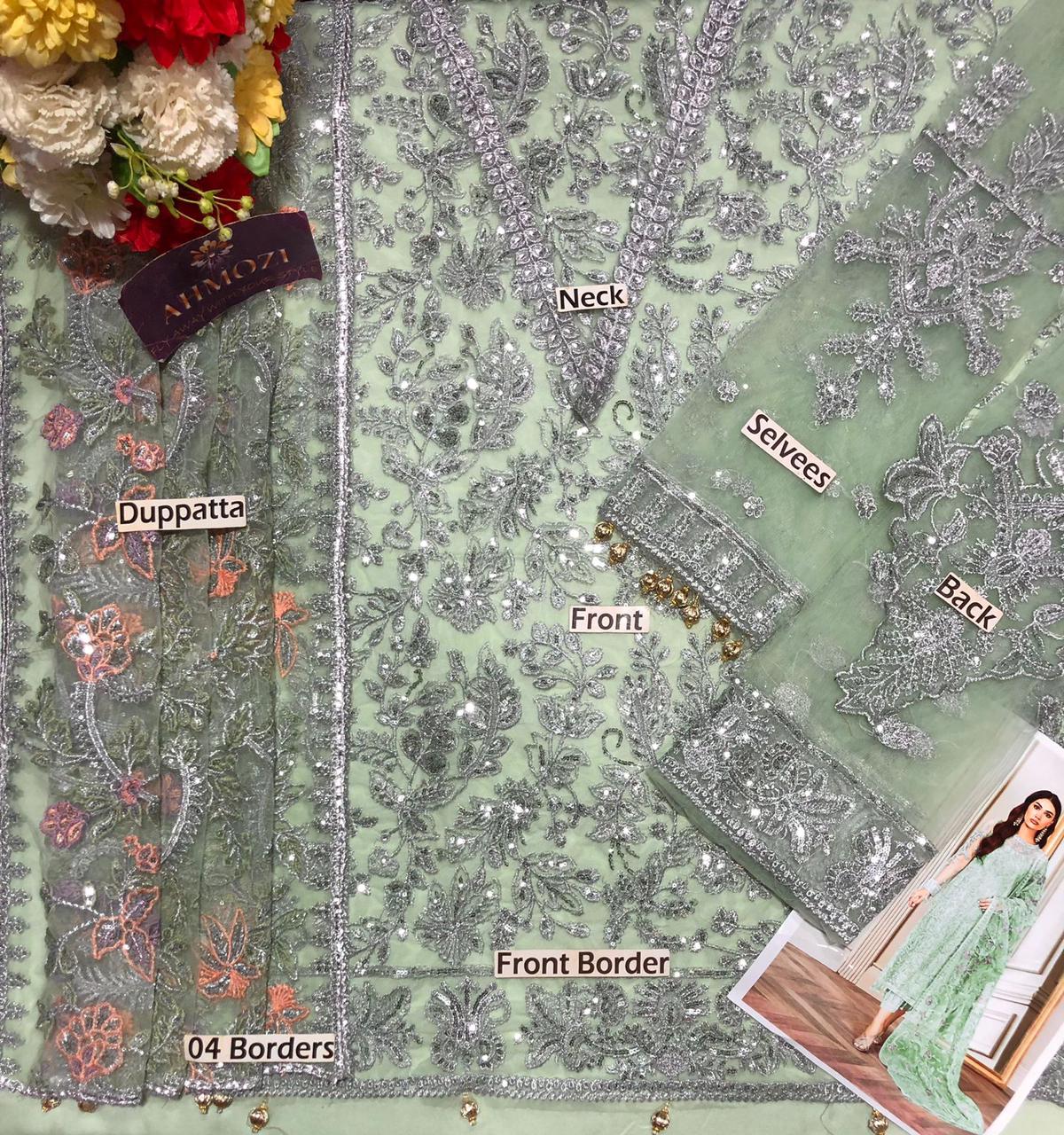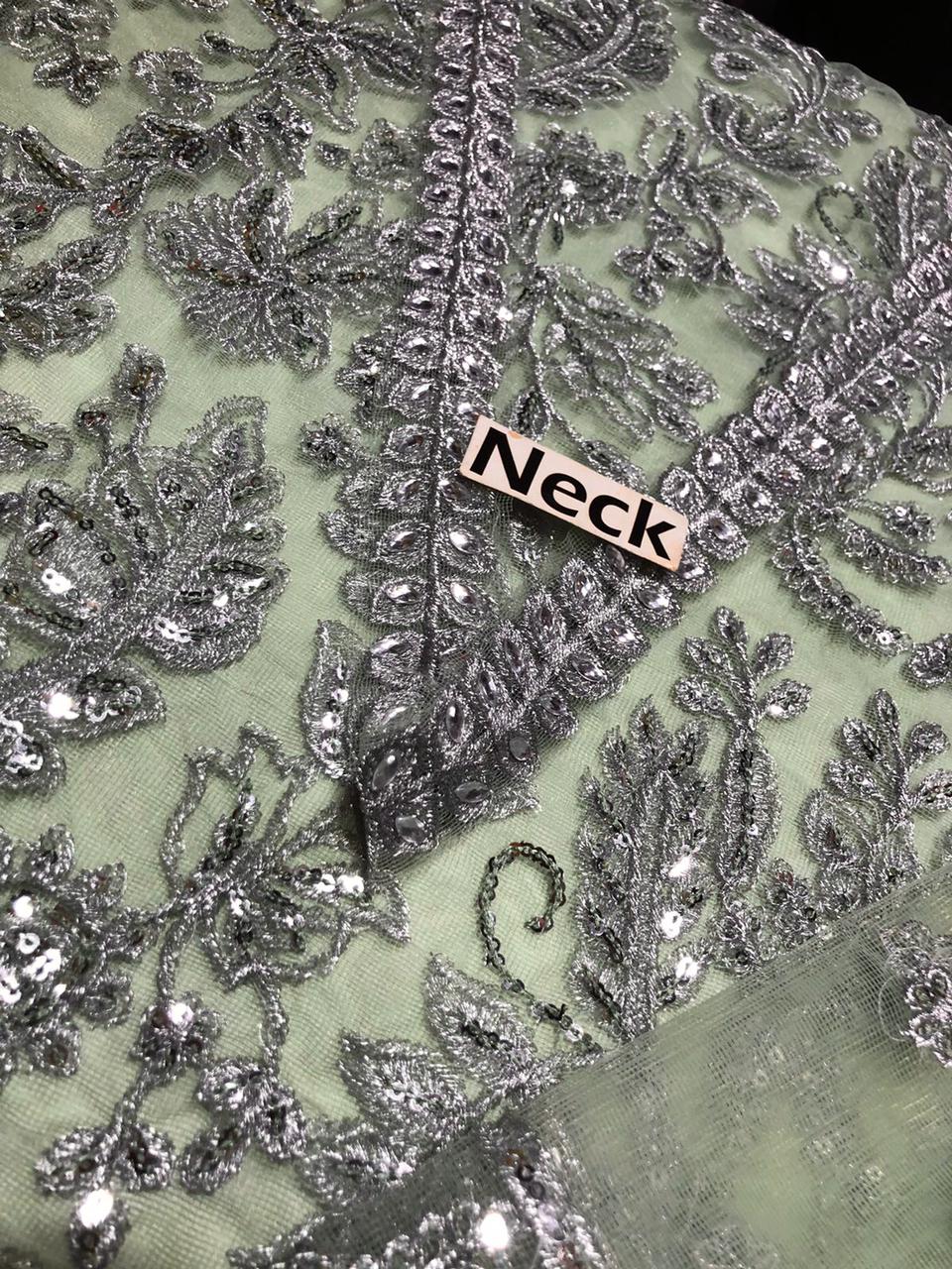 Fully Embroidered Net back with heavy embroidered spengle work back daman boarder on fabric